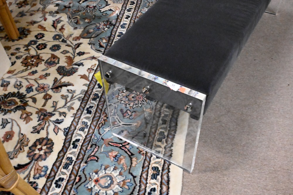 Contemporary Bench, having upholstered top and lucite base, height 17 inches, length 49 1/2 inches, depth 15 inches.