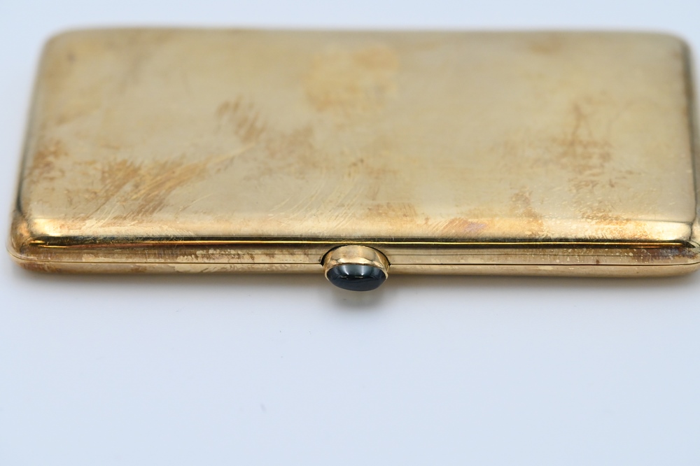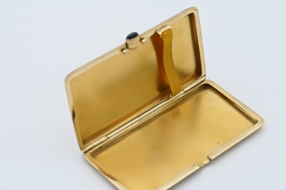 Dutch 14 Karat Gold Cigarette Case, mounted with blue sapphire, 1 3/4 x 3 1/4 x 3/16 inches, 67 grams. Provenance: Collection of Anton Peek previously from the Hague.