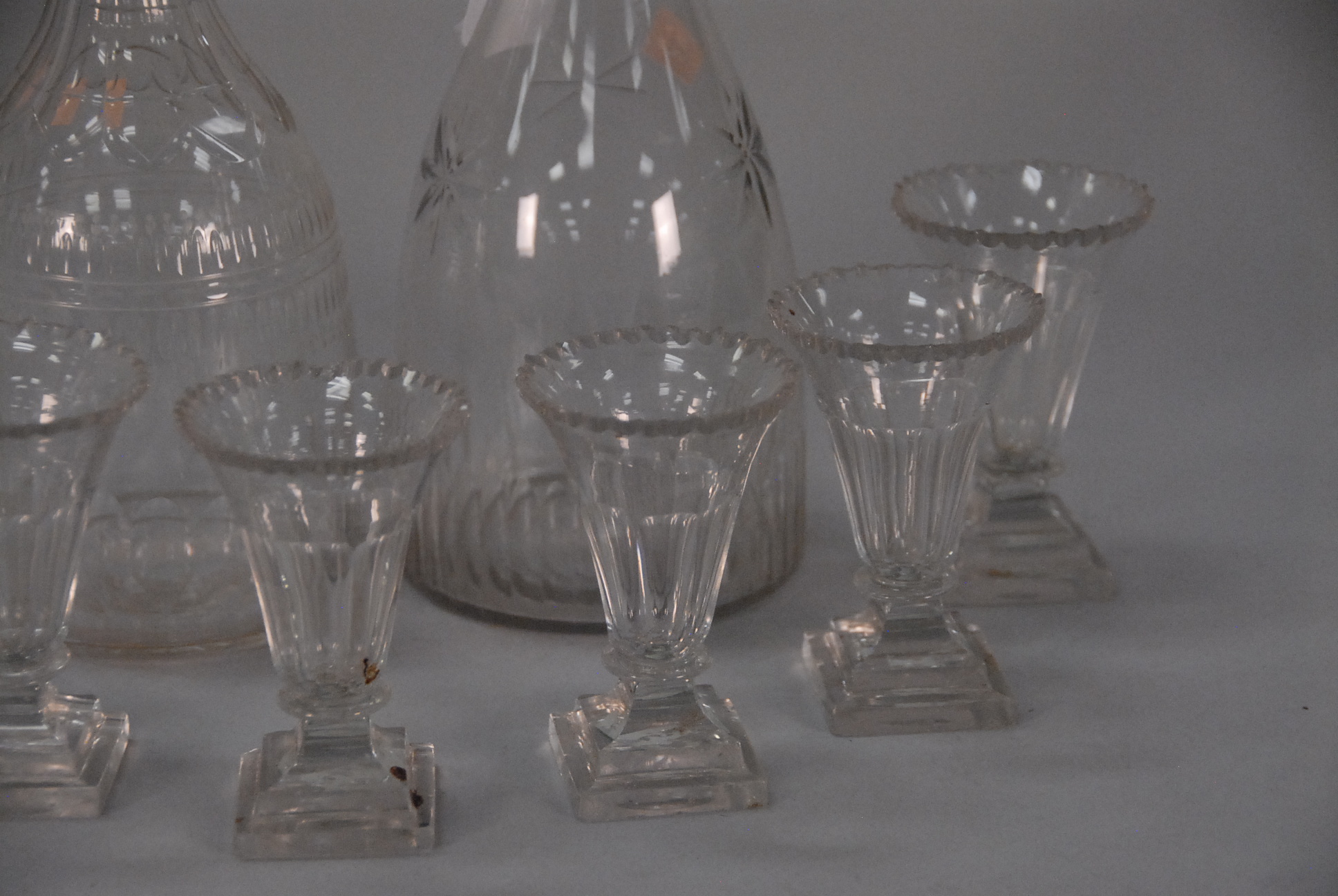 Eight piece Crystal lot to include two decanters and six glasses with heavy square crystal bases.