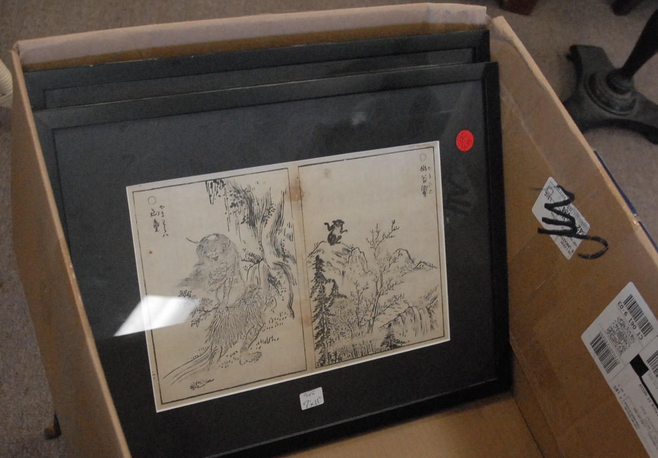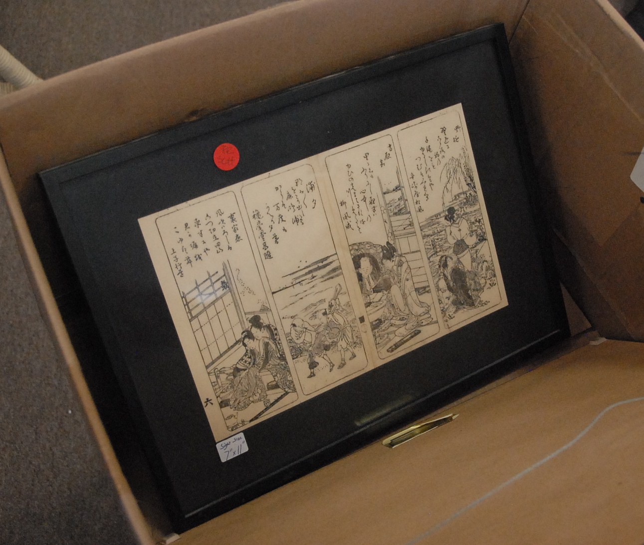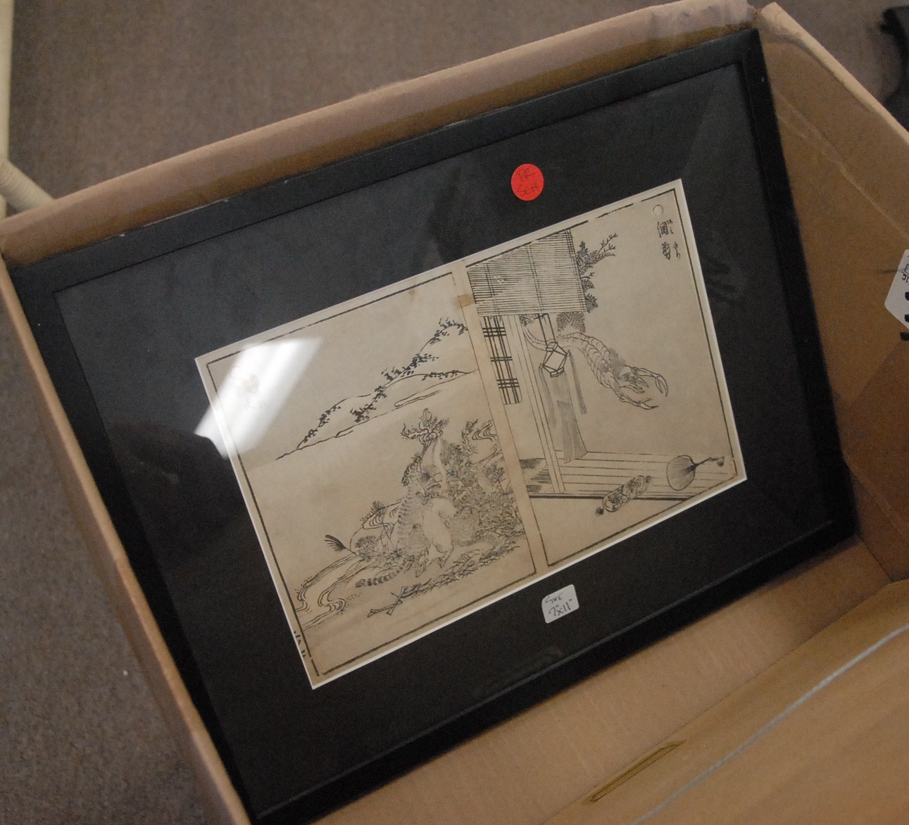 Eight piece lot to include Japanese paintings including fan paintings and woodblock prints.