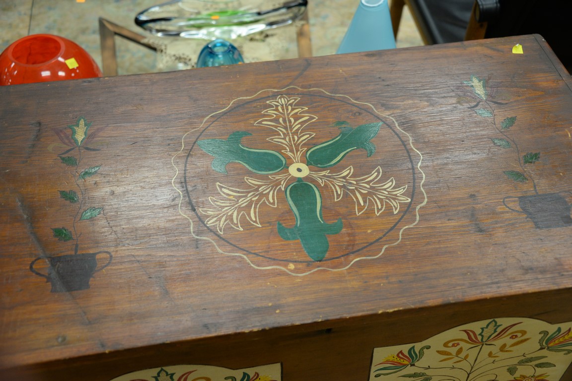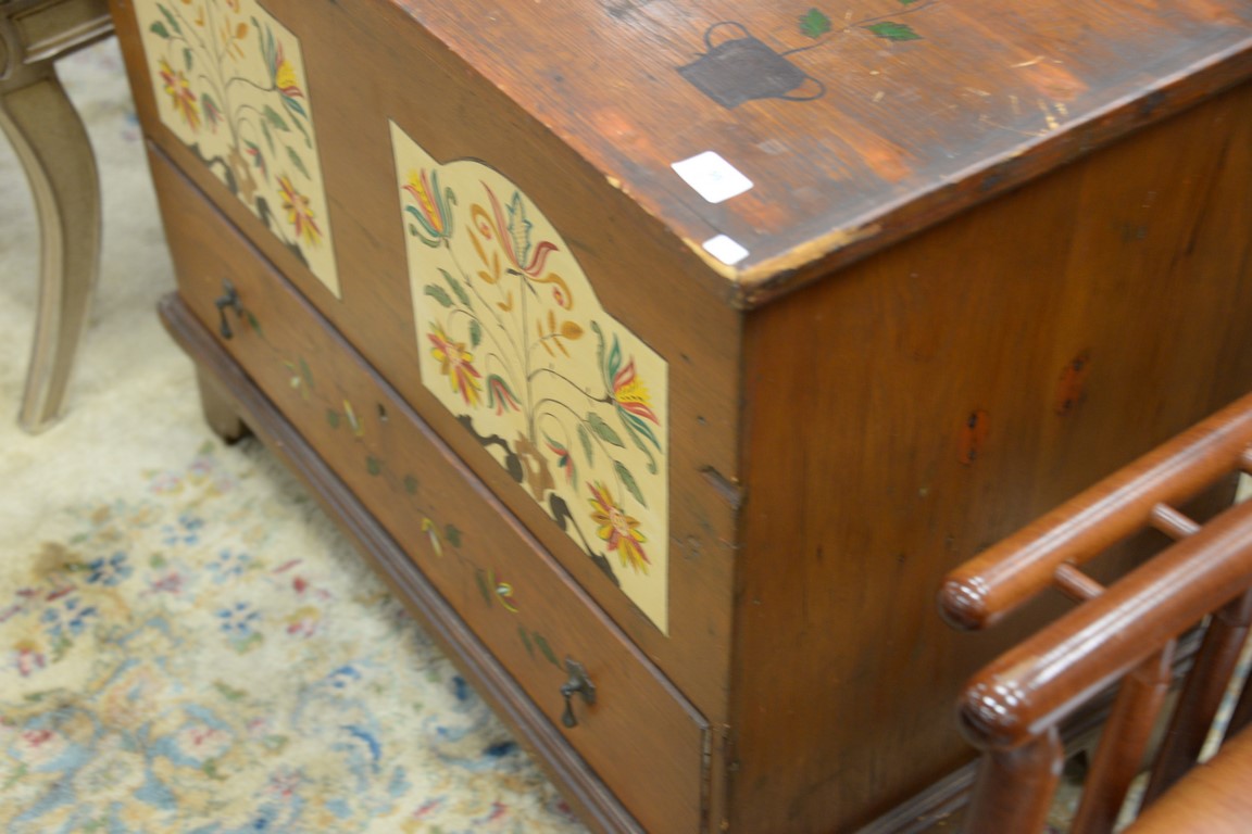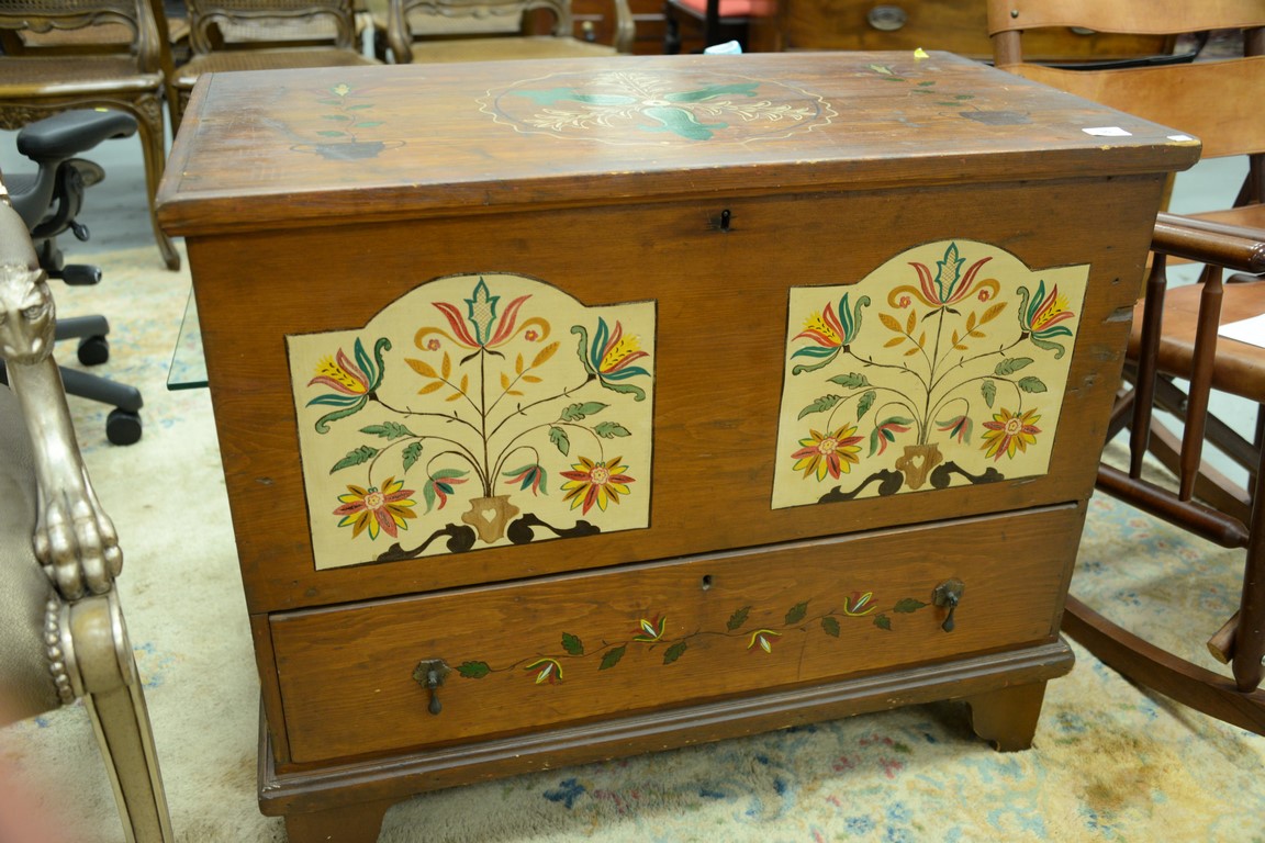 Lot 99: Federal lift top blanket chest with one drawer on bracket feet, circa 1790-1810 repainted. ht. 29 1/2 in. wd. 33 1/2 in. dp. 19 in.