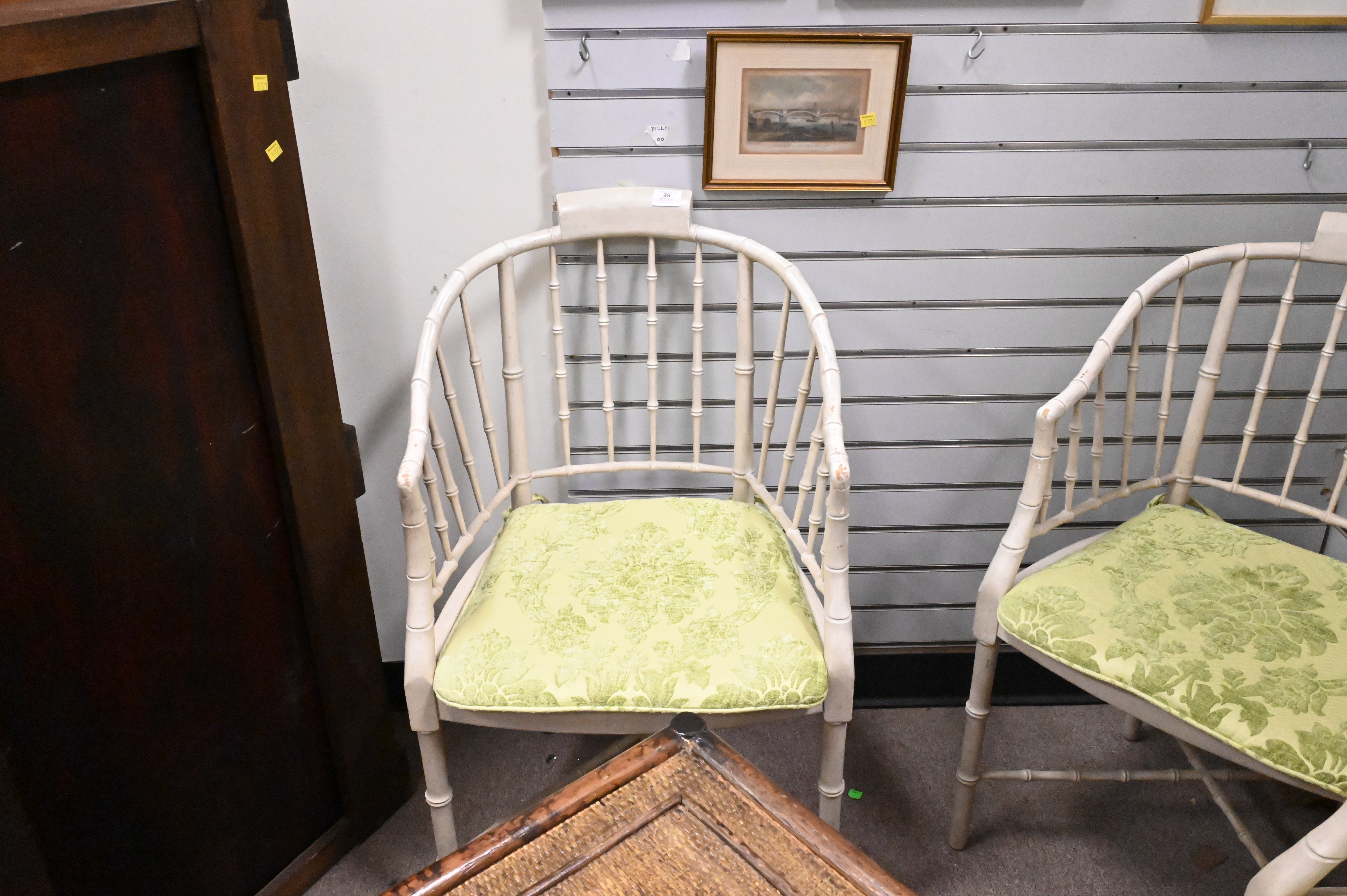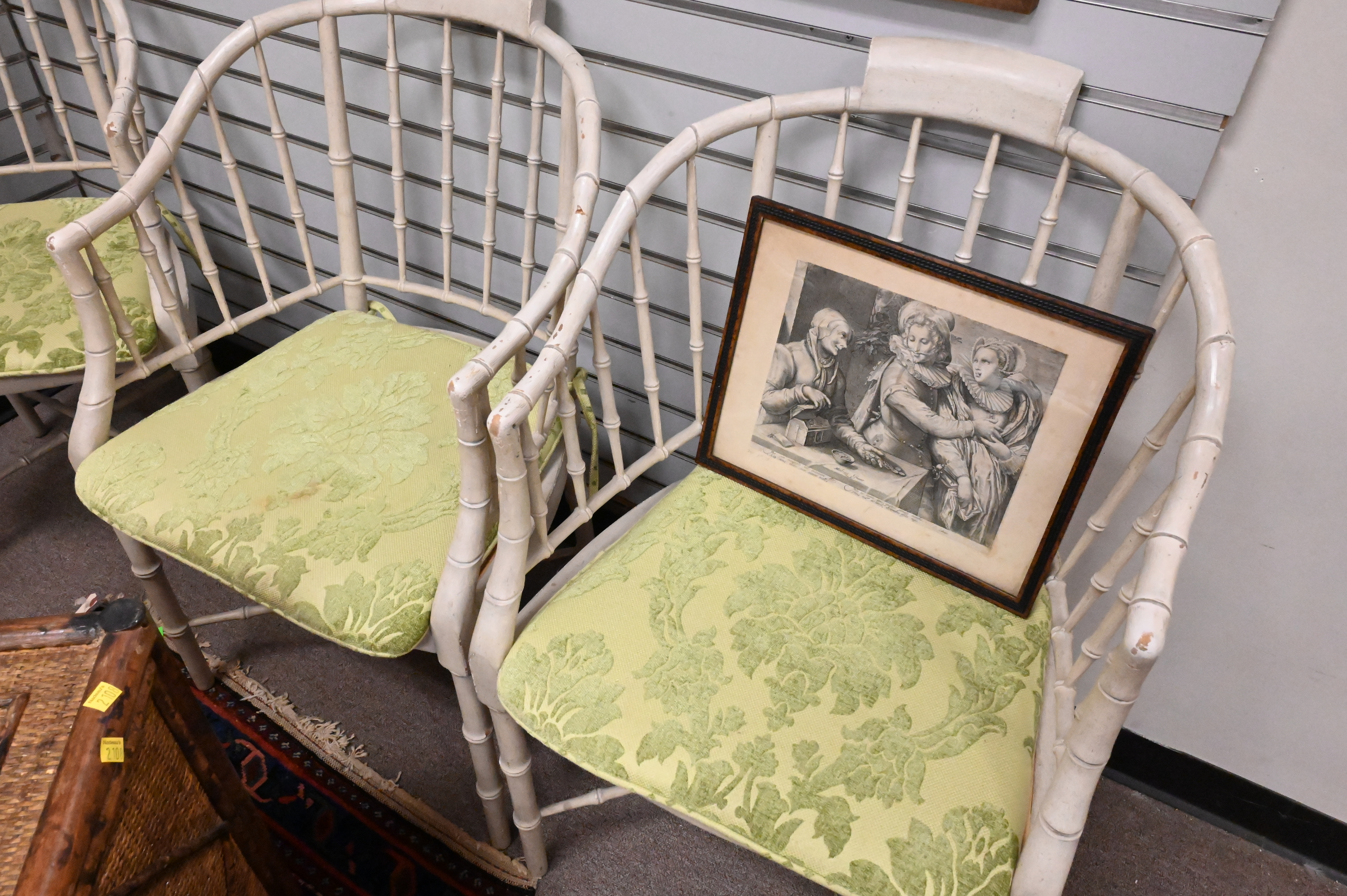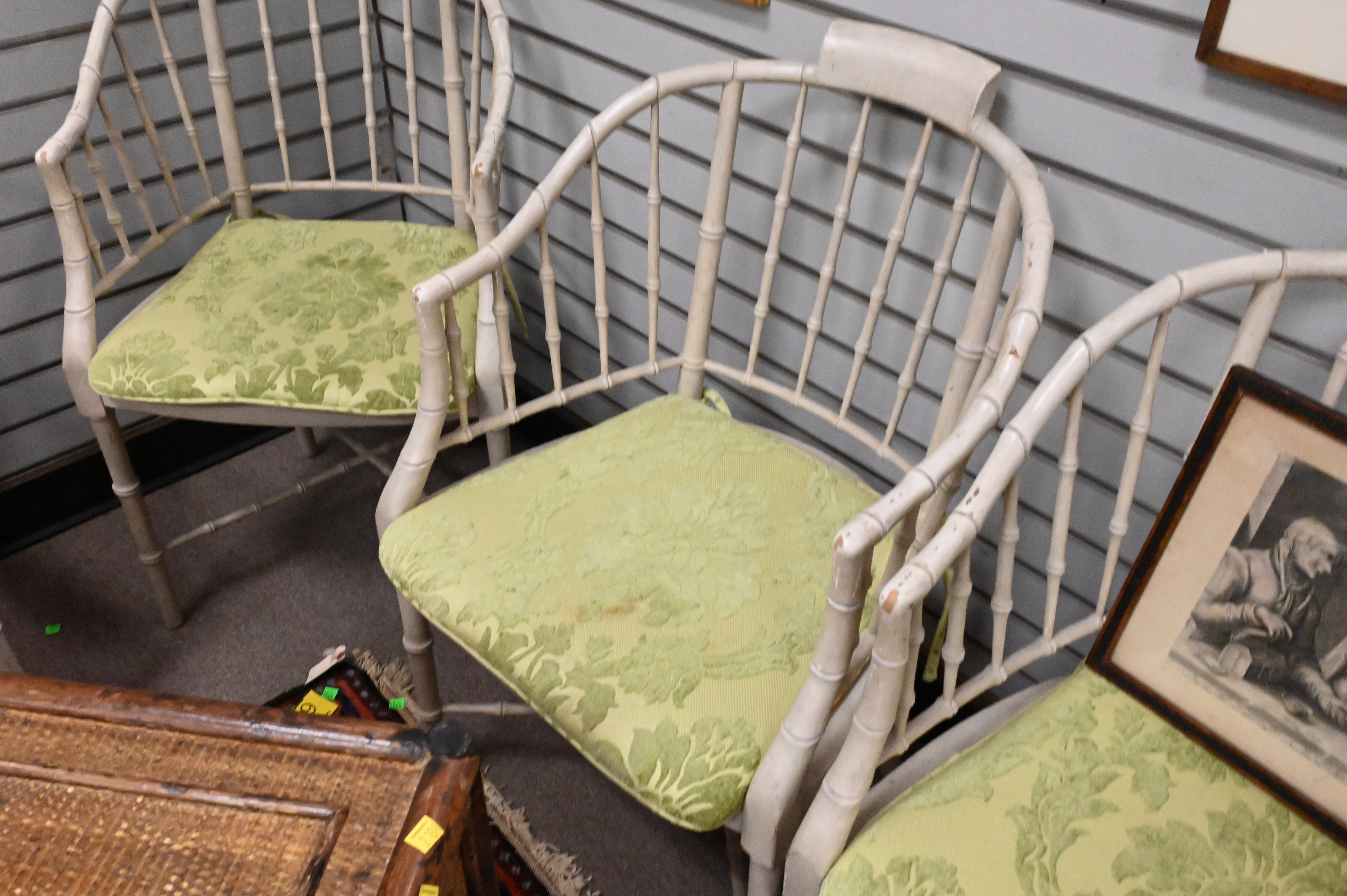 Five Piece Faux Bamboo Lot, to include a Baker set of 4 faux bamboo arm chairs, with caned seats, along with a three drawer bamboo and raffia chest, chair height 35 1/2 inches, width 21 inches.