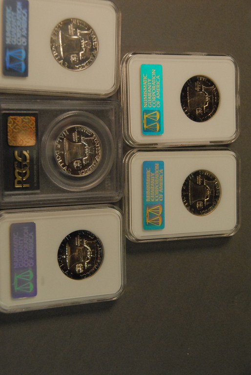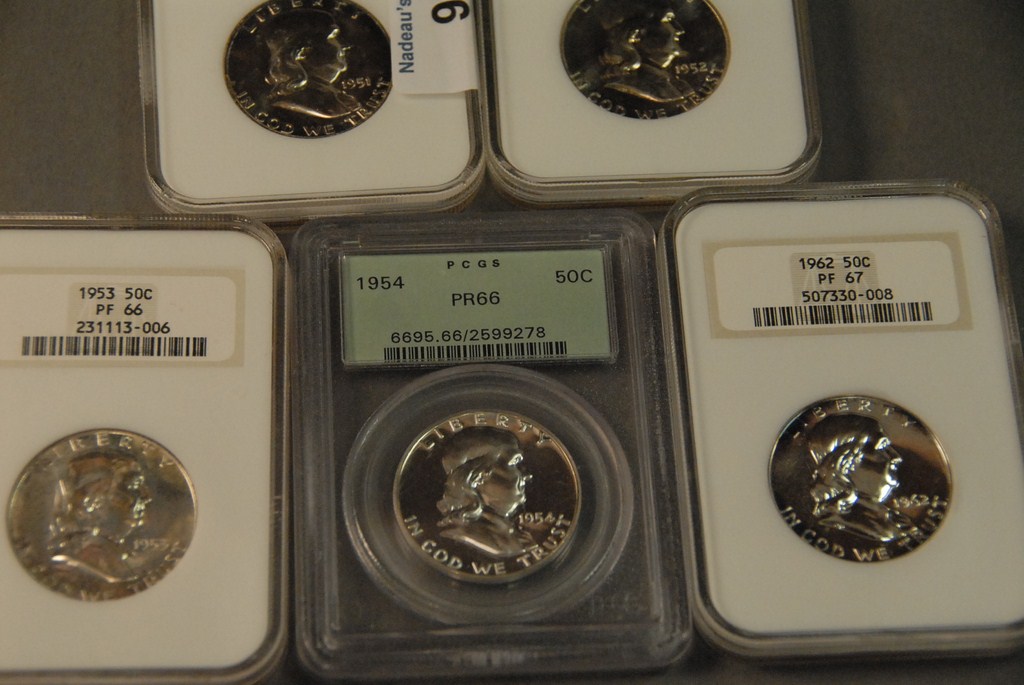 Five proof half dollars 1951 NGC 65, 1952 NGC 66, 1953 NGC 66, 1954 PCGS 66, and 1962 NGC 67.
