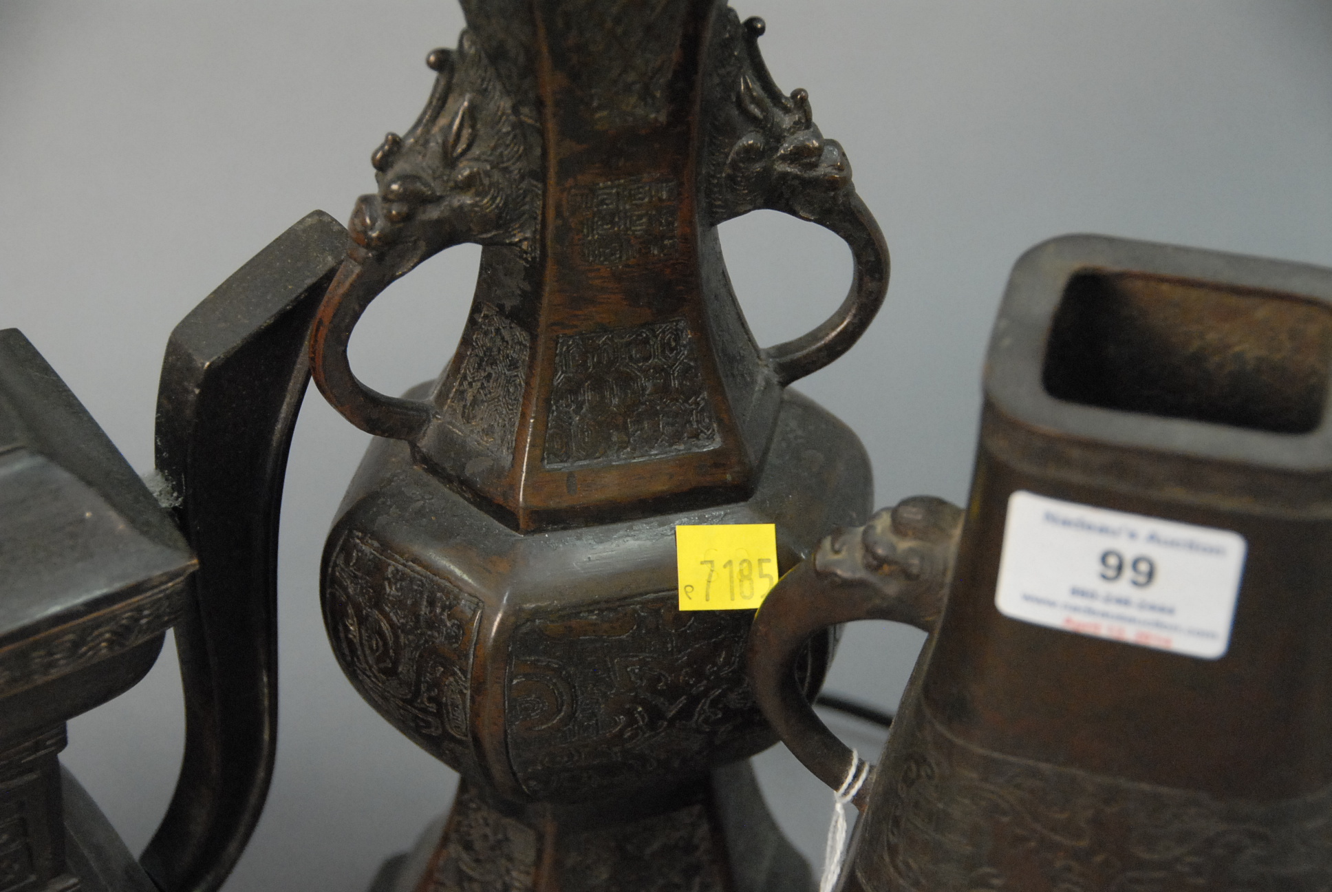 Lot 99: Four piece bronze lot to include vase made into a table lamp, a covered urn, a vase, and a foo dog tail loose.