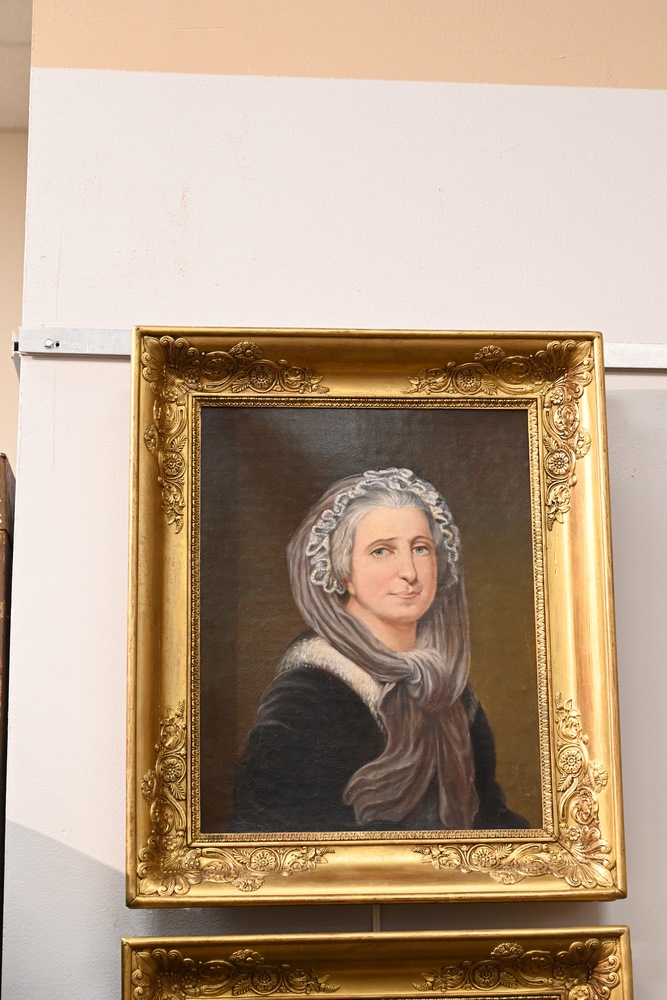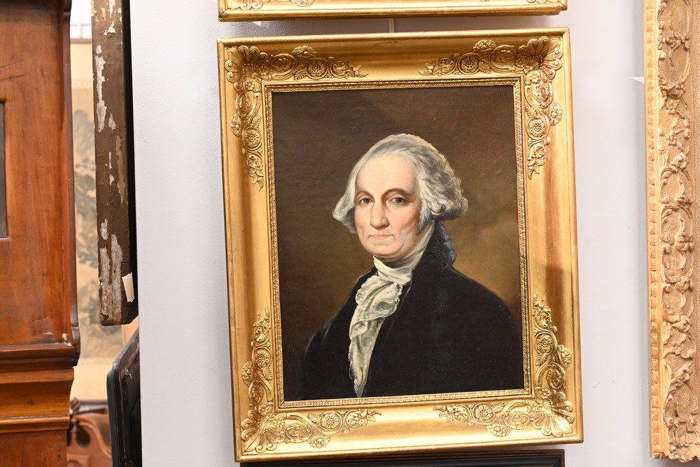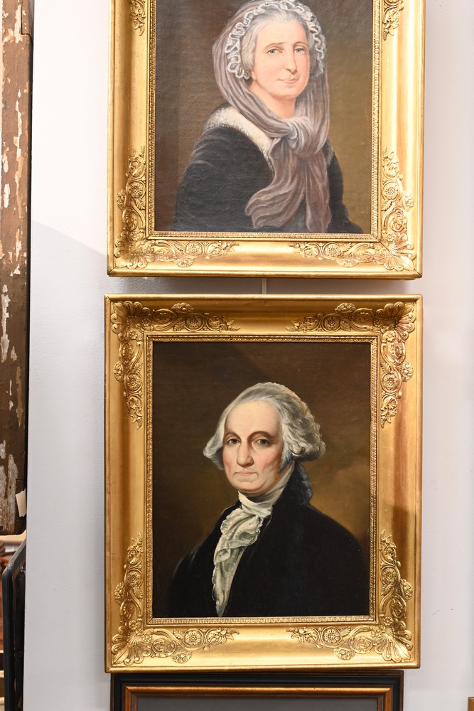 Lot 99: Pair of American School 19th century portraits George and Martha Washington both oil on relined canvas unsigned both housed in matching gilt wood frames 17 1/2 x 14 1/2 inches