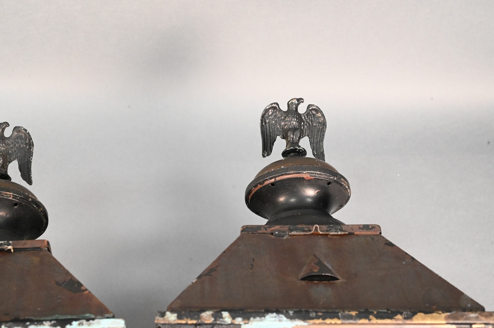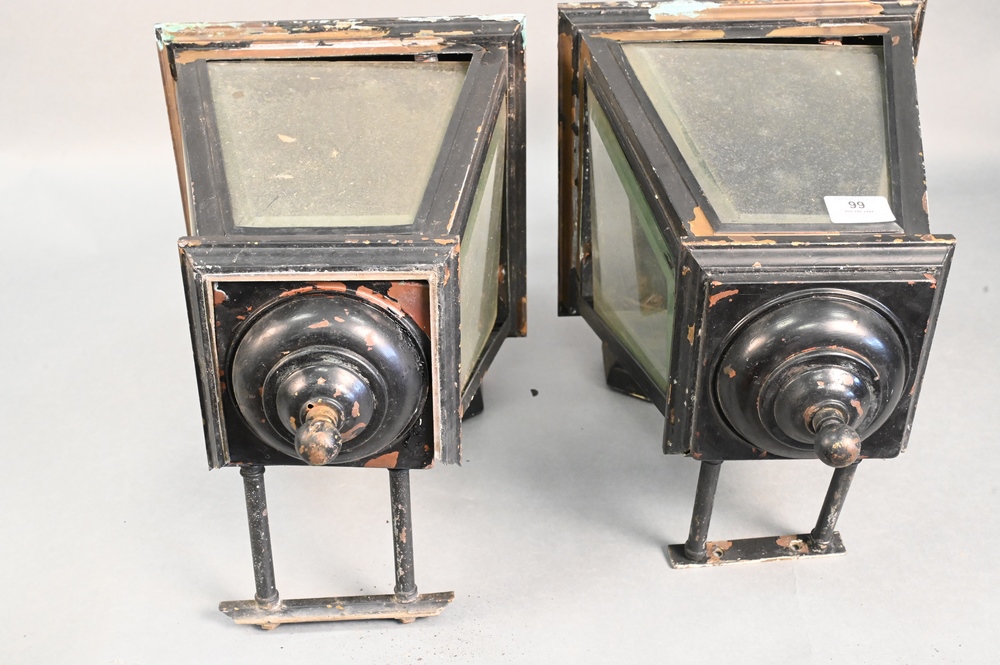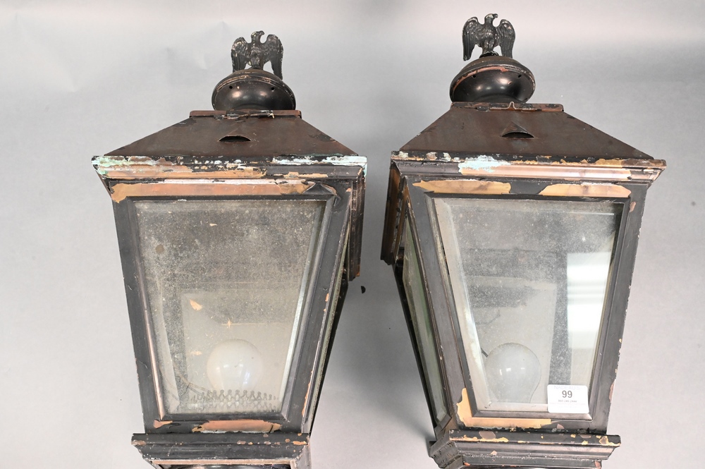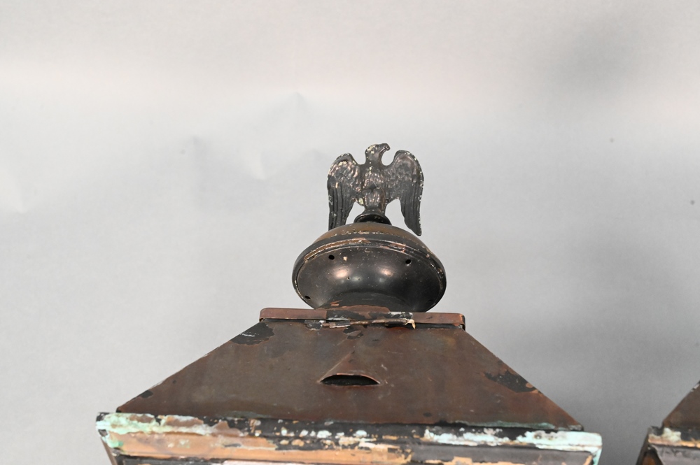 Pair of Brass Outdoor Lantern Lights, having beveled glass, height 25 inches.