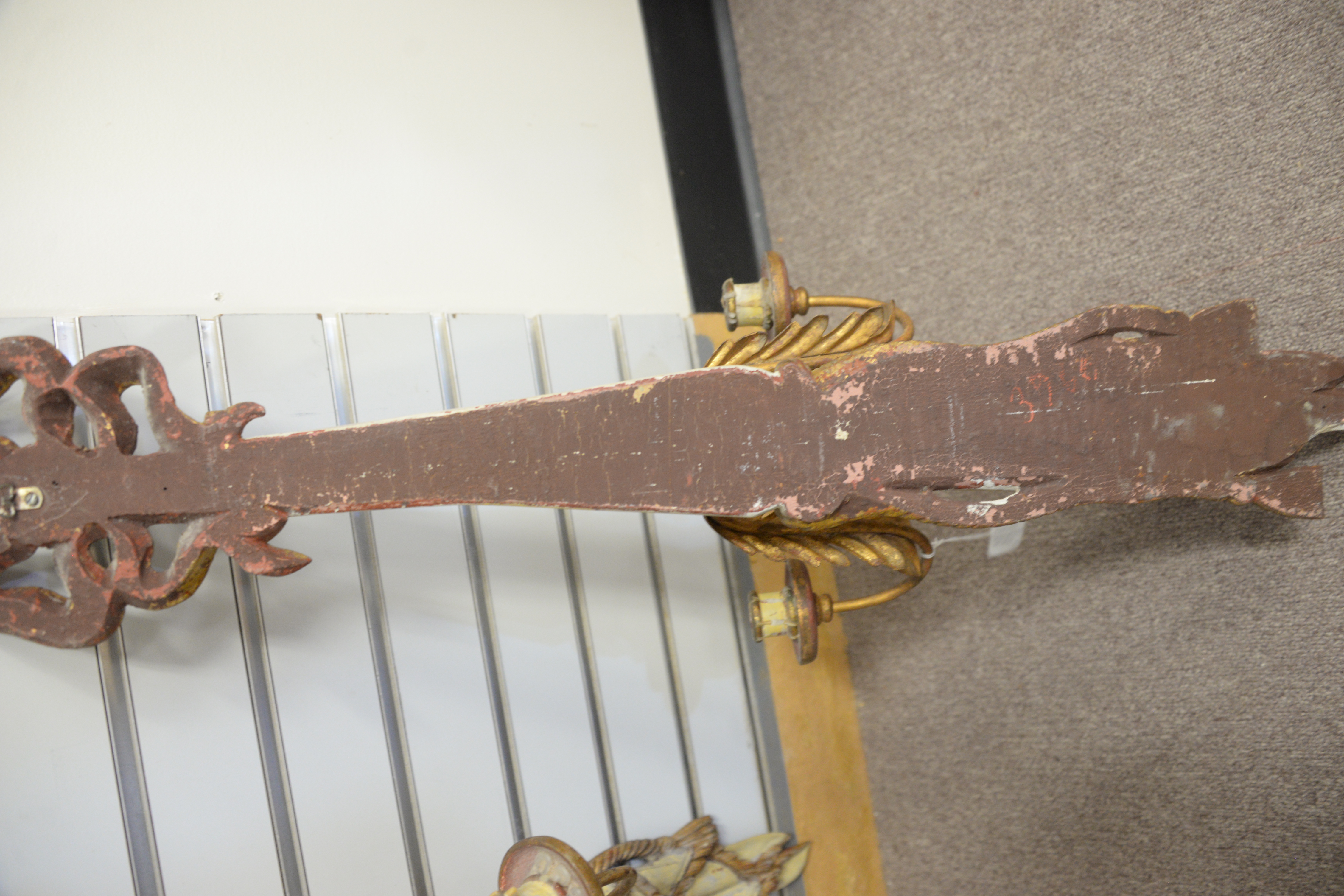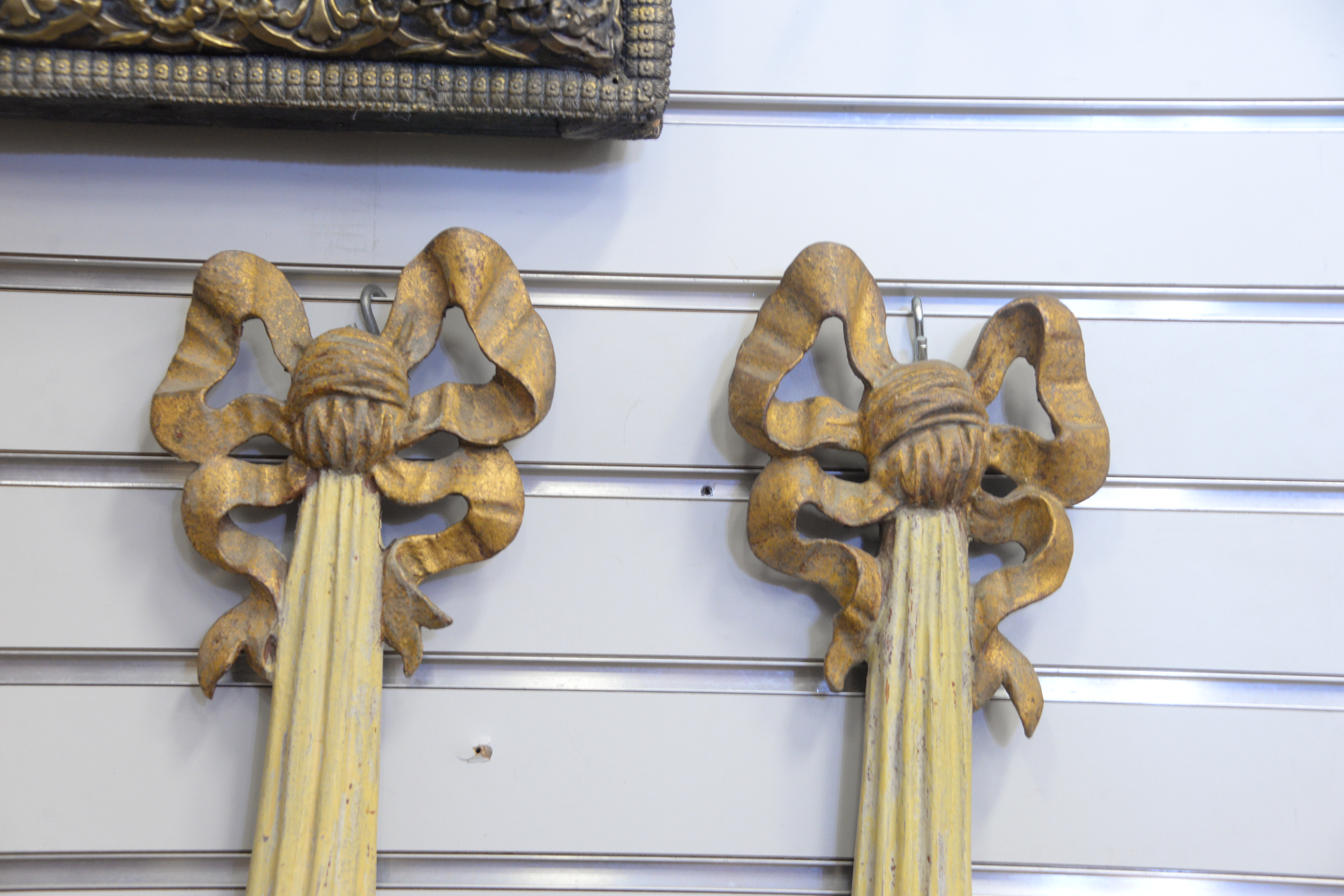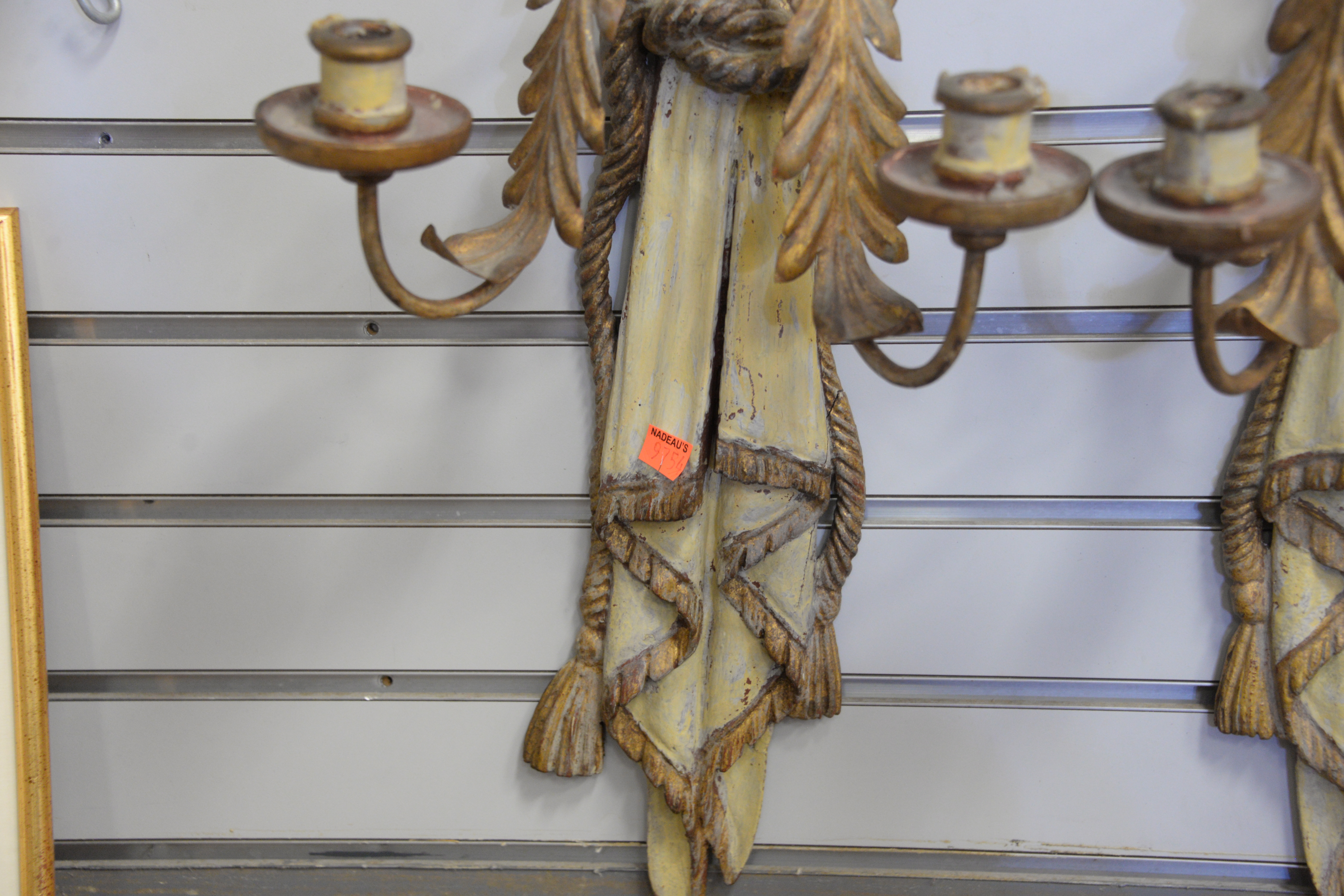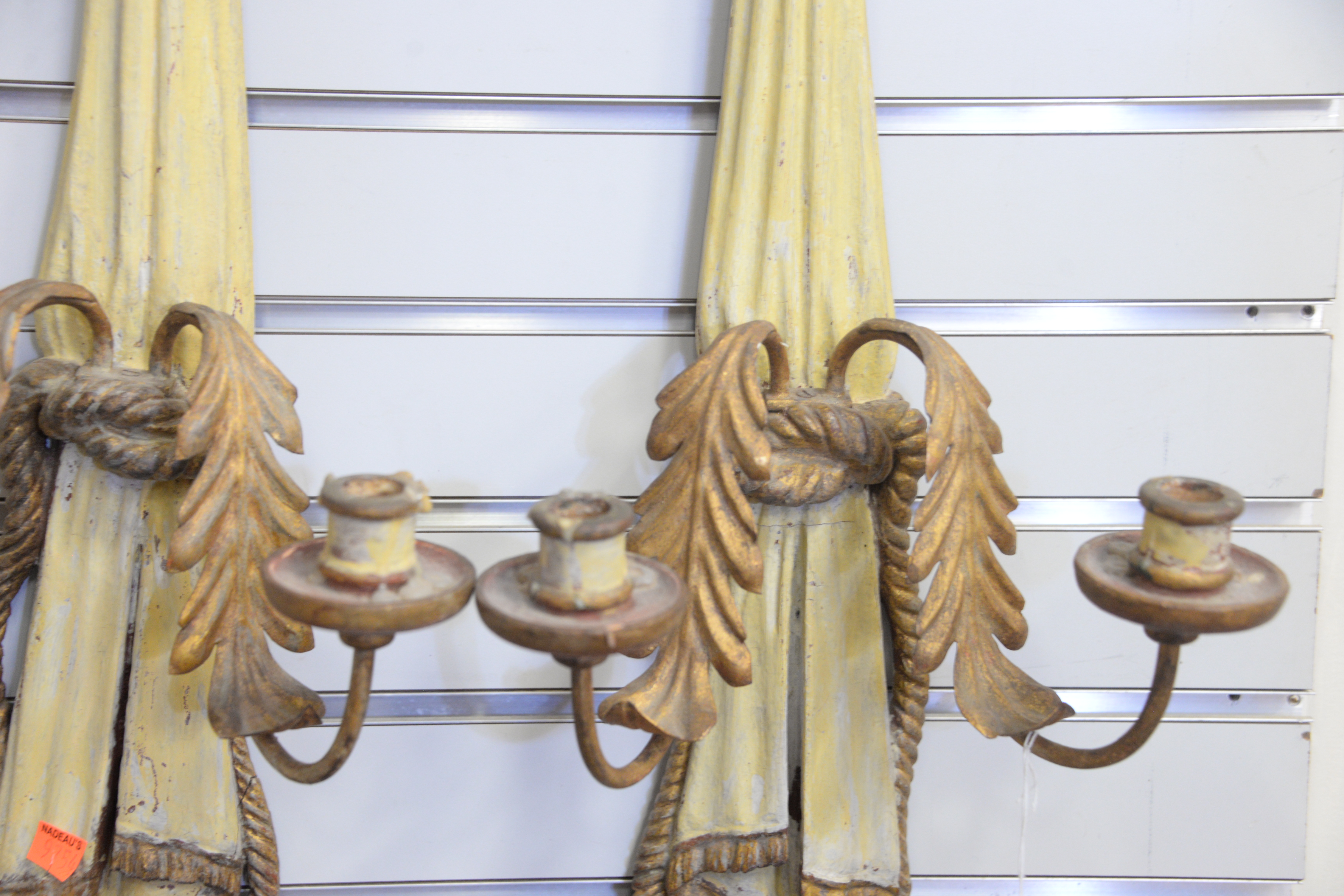 Lot 99: Pair of French Gilt Metal and Carved Painted Wood Two Light Sconces, in the form of a drape with curtain ties, height 32 inches.