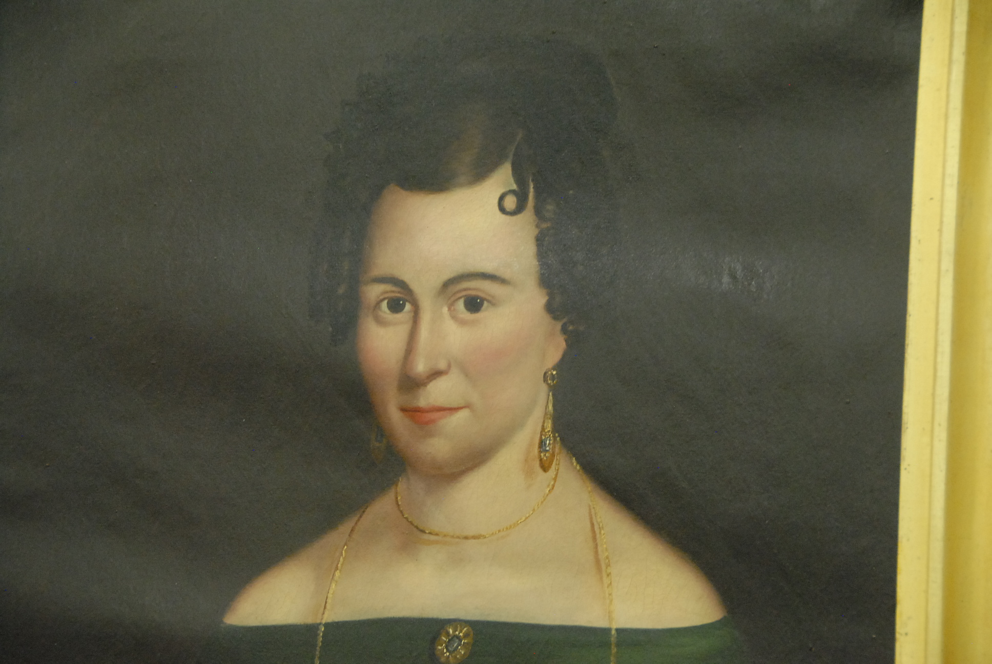 Primitive oil on canvas portrait of a woman with book in hand in original gilt frame. 30 x 25