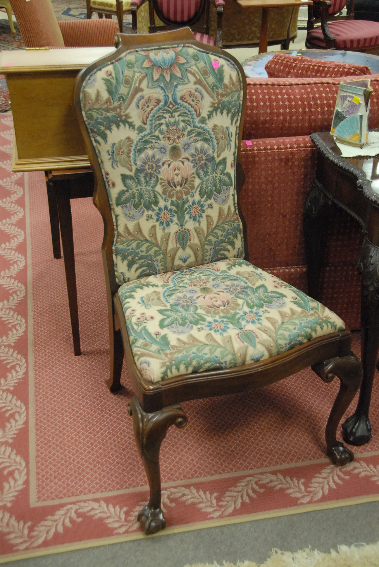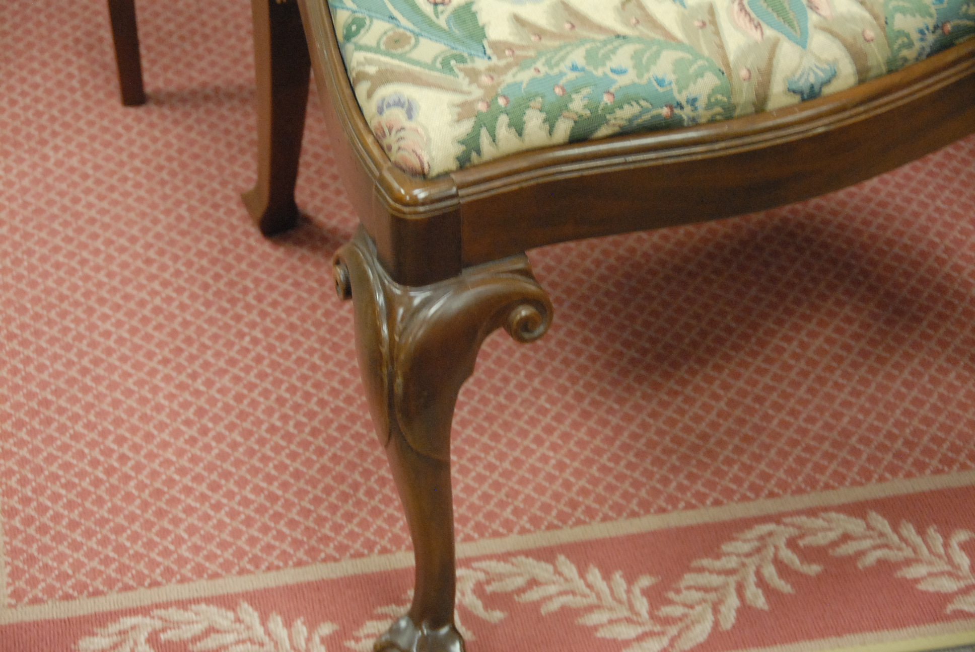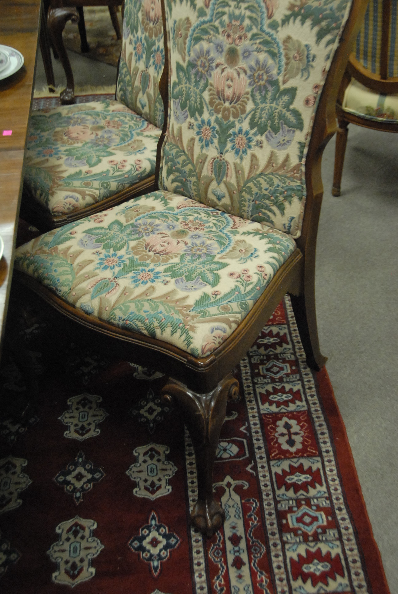 Set of ten upholstered dining chairs with ball and claw feet by Southwood.