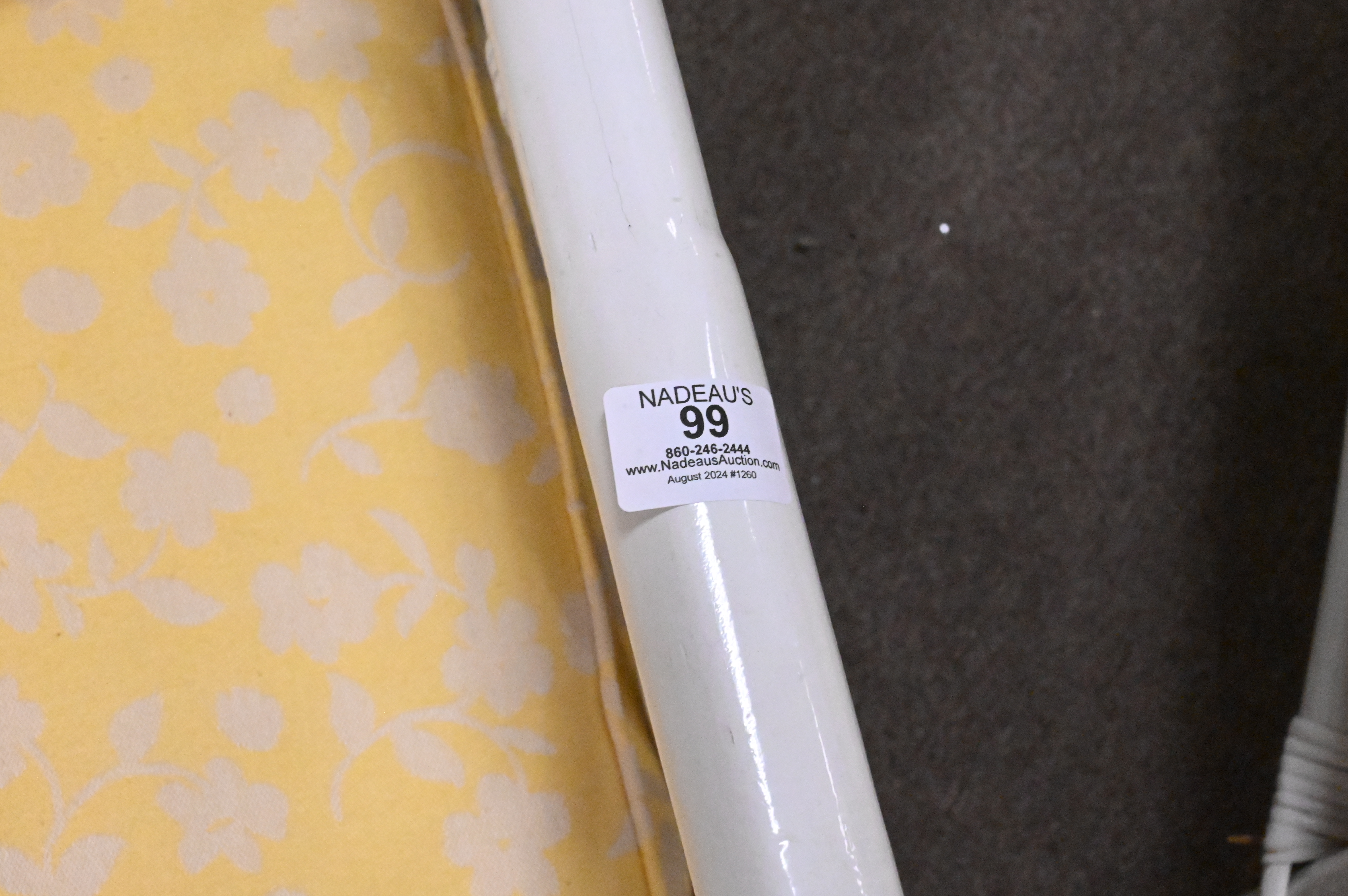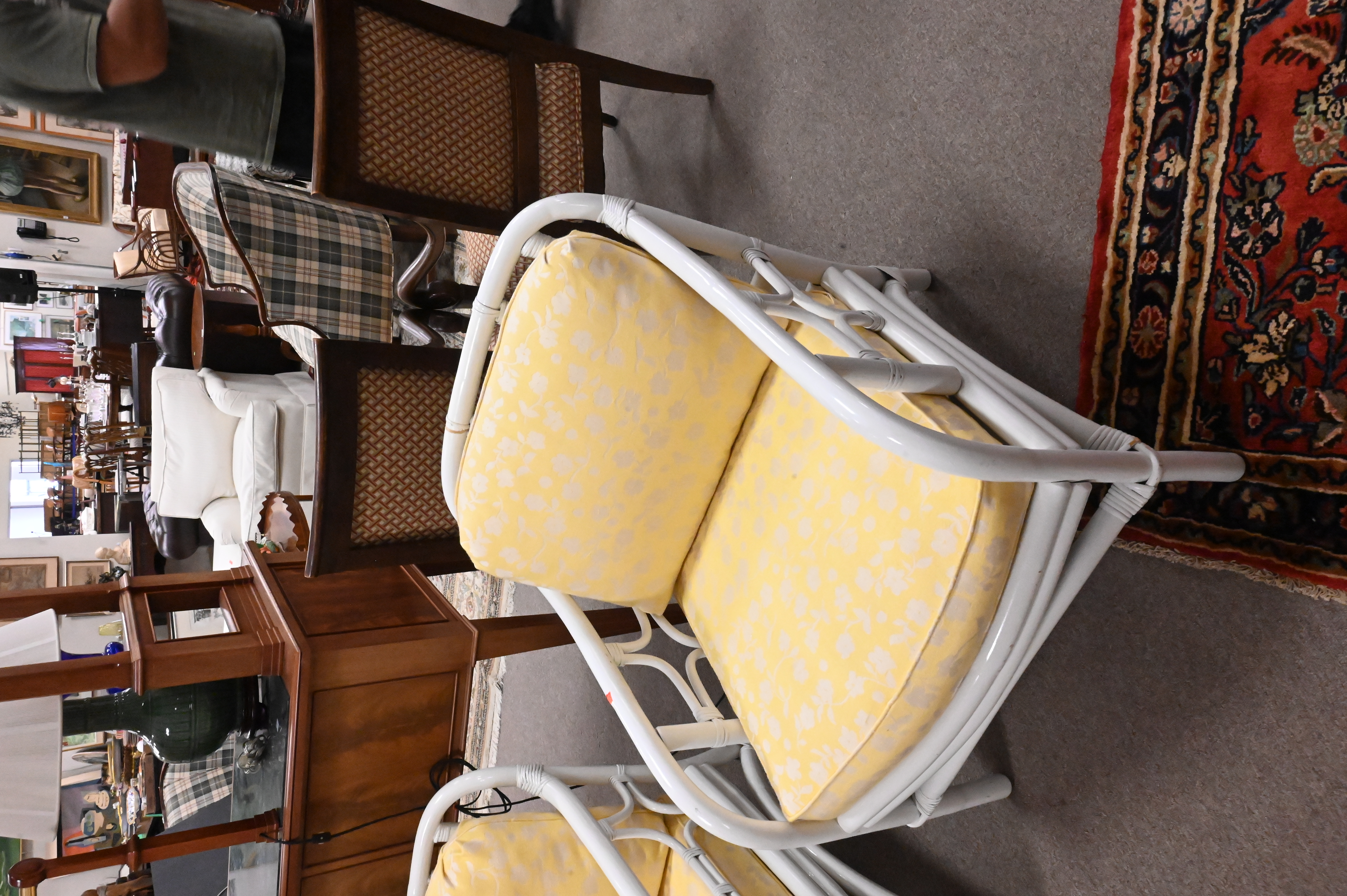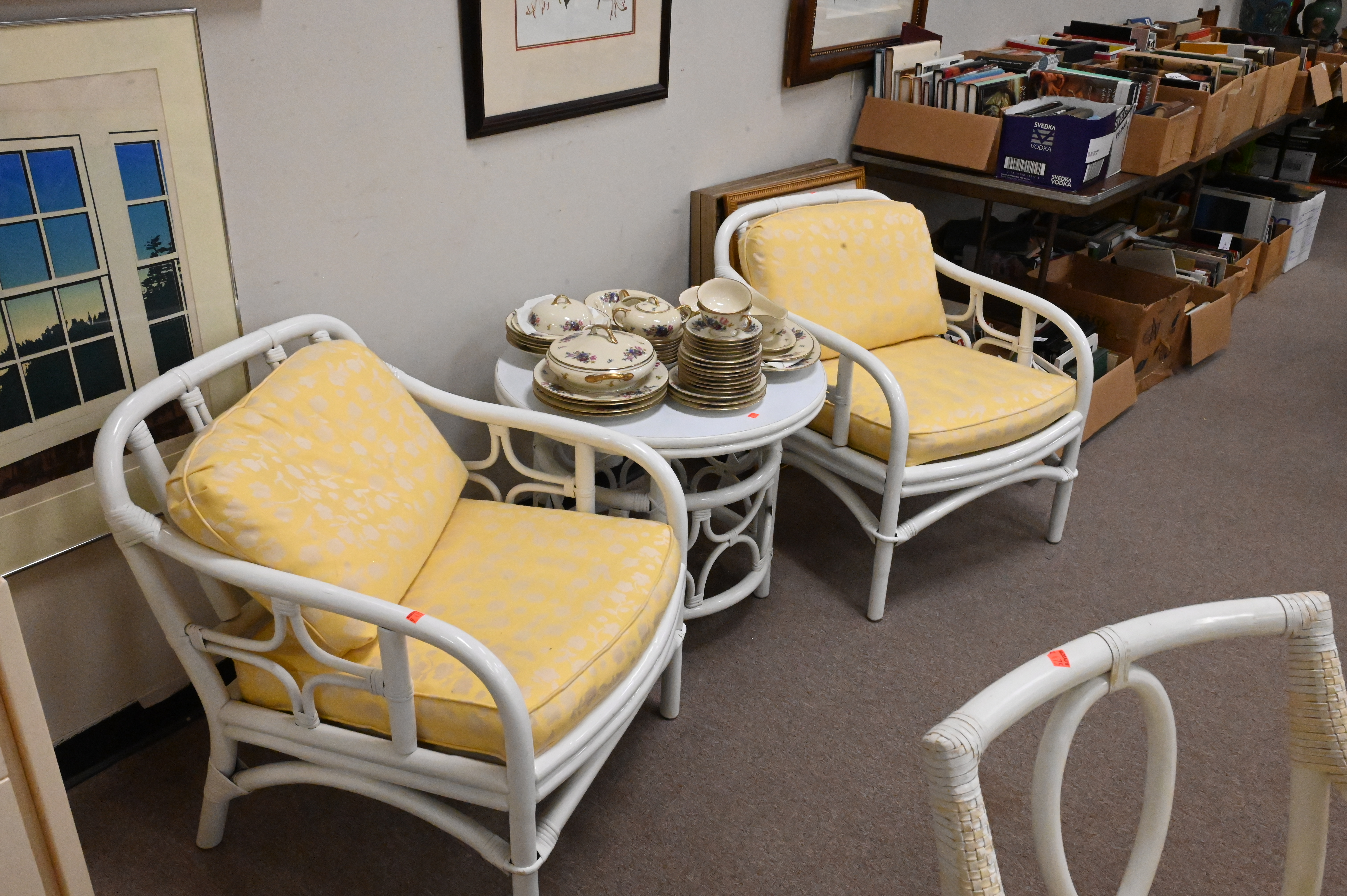 four armchairs, loveseat, round table, with custom upholstered cushions