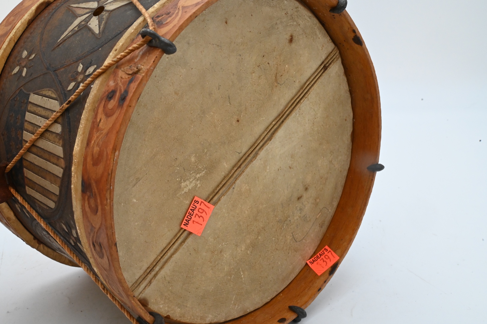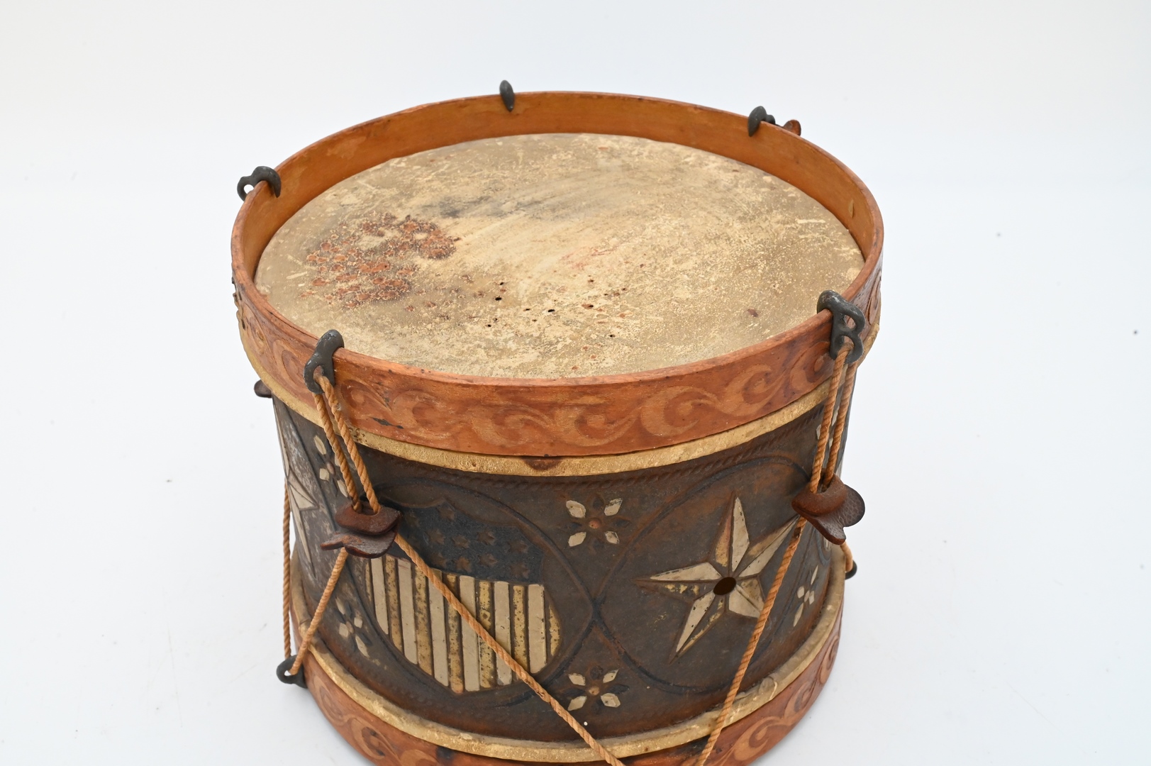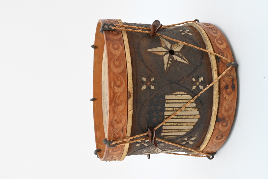 Small Wood and Tin Drum, original decoration depicting a painted star and American shield, height 7 1/2 inches, diameter 9 inches. Estate of Peter Tillou, Litchfield, Connecticut.
