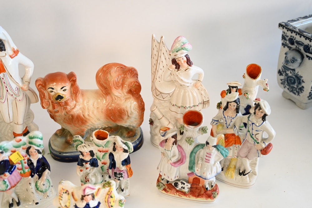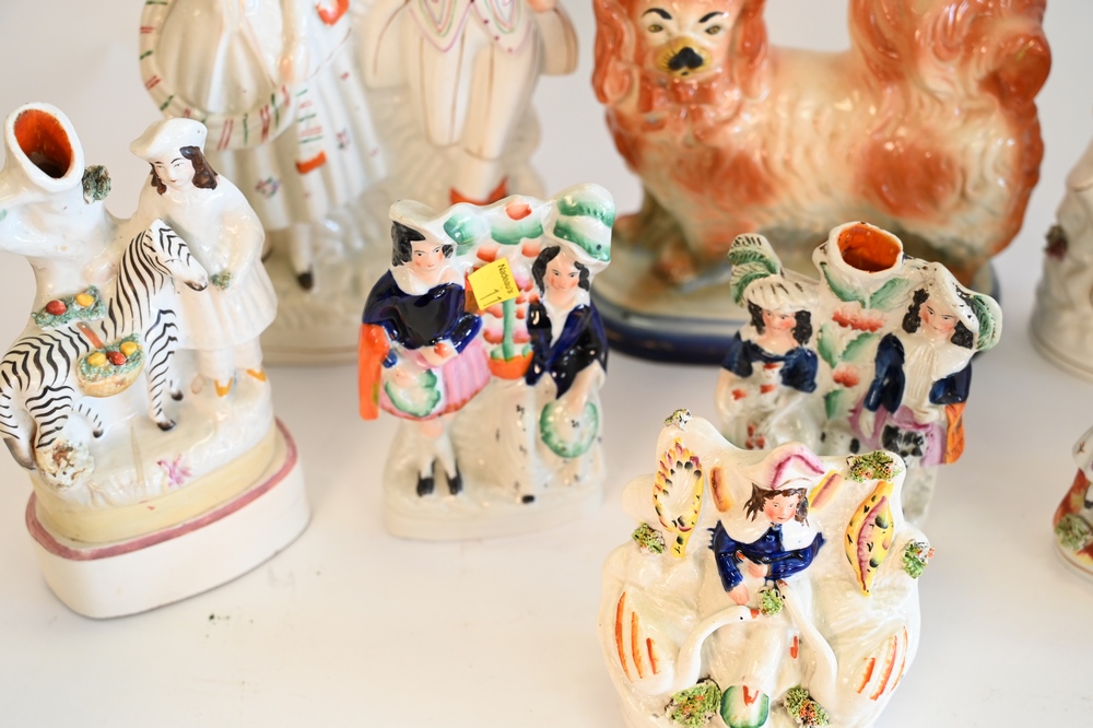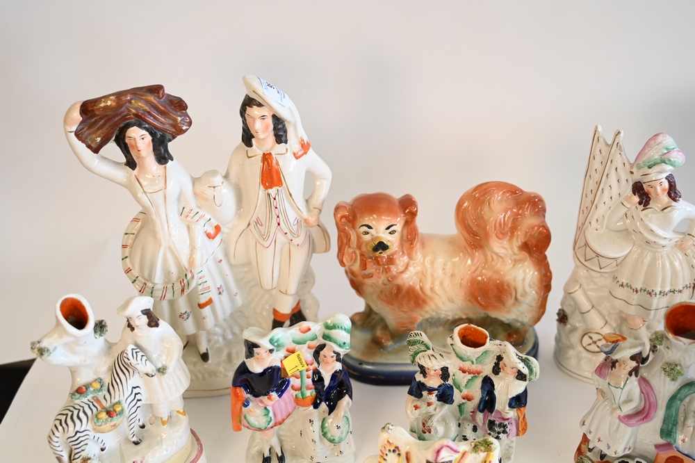 Lot 99: Ten Piece Figural Staffordshire Group, tallest 12 1/2 inches.