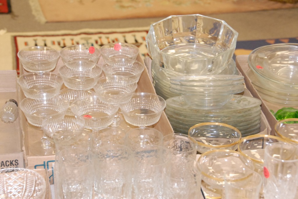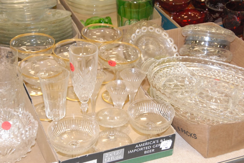 Thirteen box lots of glassware, pressed glass, cut glass, crystal, dishes, bowls, ruby glass stems, stems, plates, decanters.