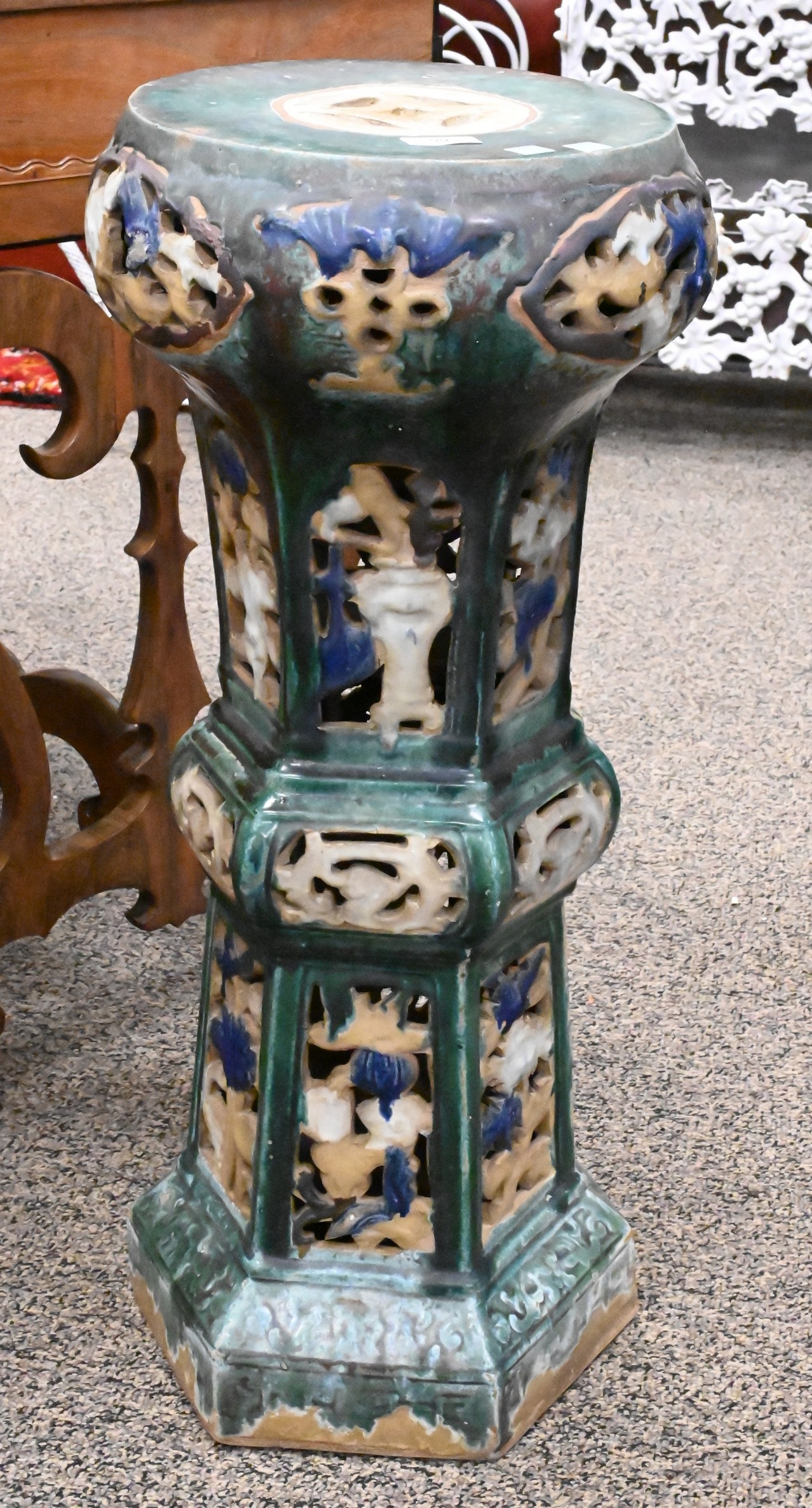 height 19 inches, Chinese Majolica jardiniere pedestal in green, blue and white with openwork detail