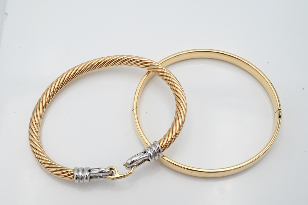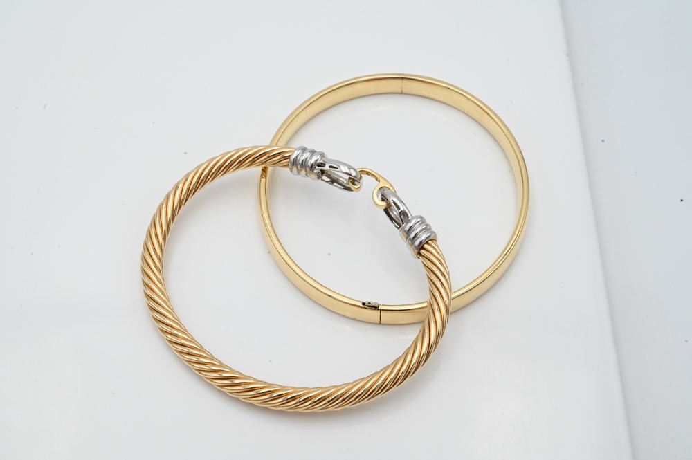 Two 14 Karat Yellow and White Gold Bangle Bracelets, 19.5 grams.