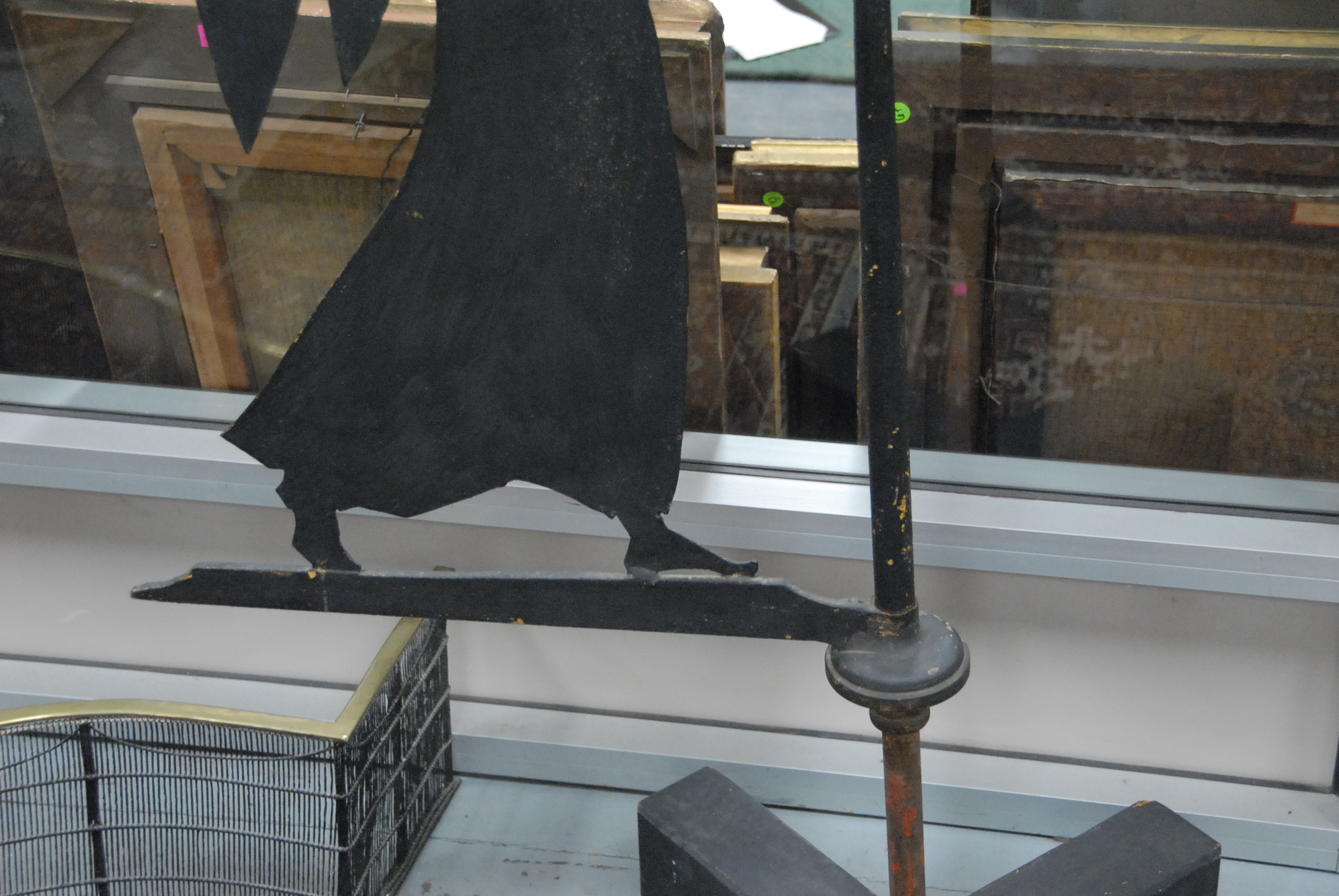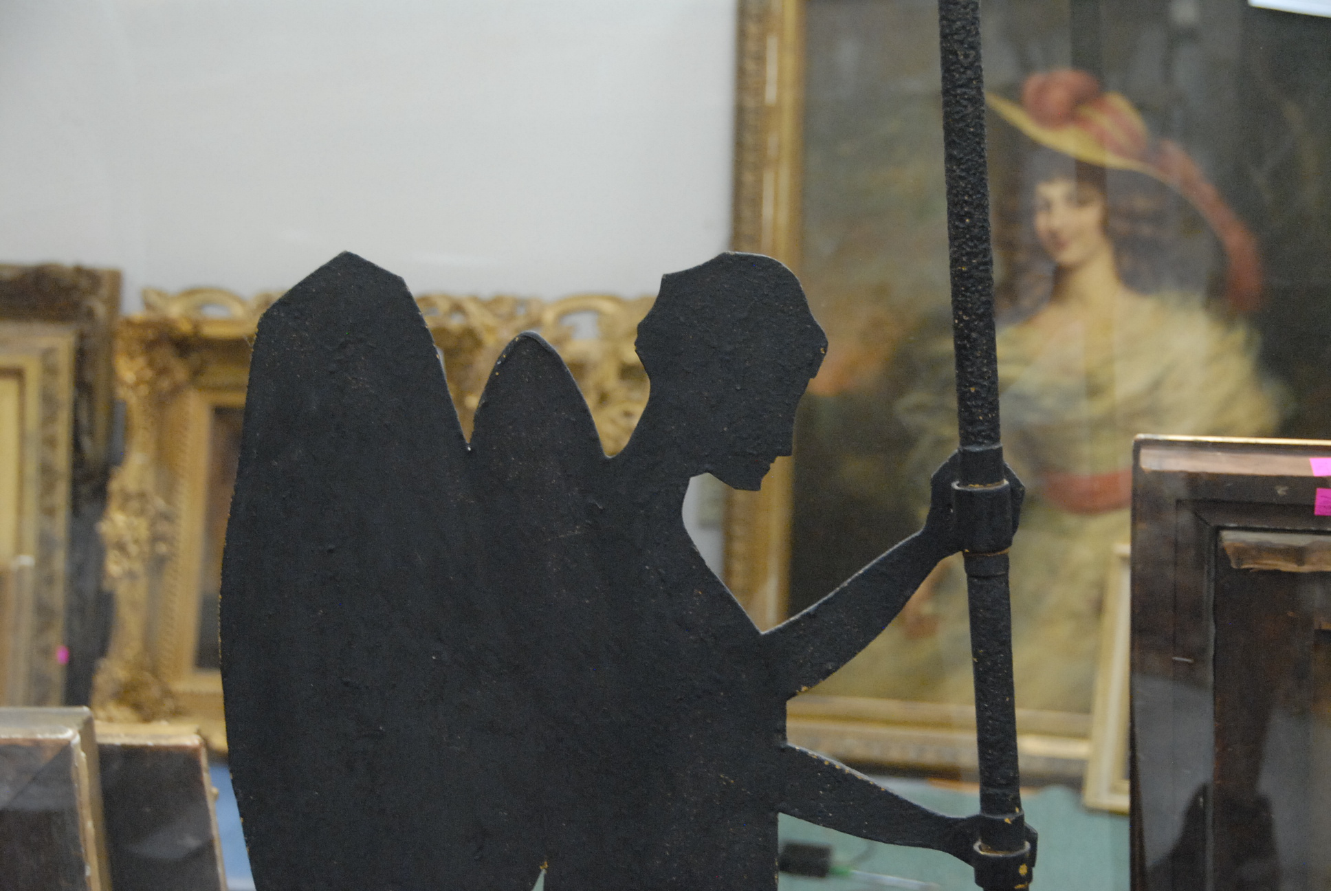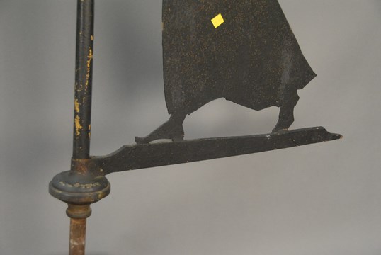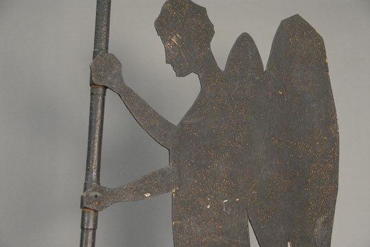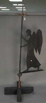 Angel sheet iron weathervane holding directional post. angel ht. 35in. total ht. 72in.